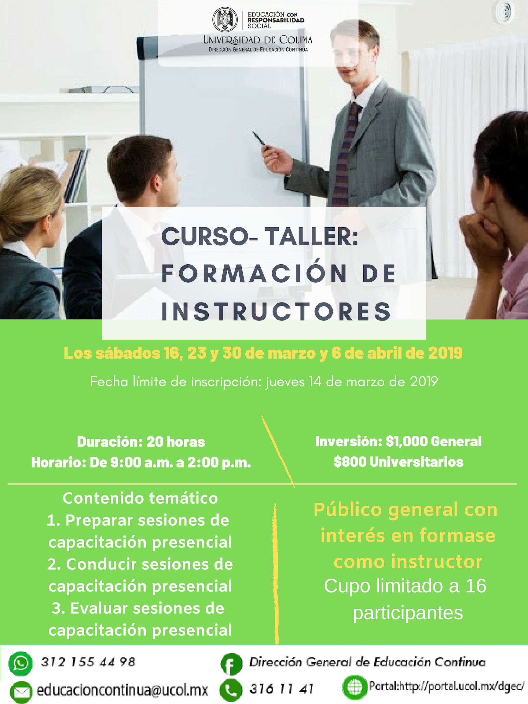 Facebook: Dirección General de Educación Continua E-mail: educacioncontinua@ucol.mx Teléfono Oficina: 316 1141 Whatsapp: 312 155 4498