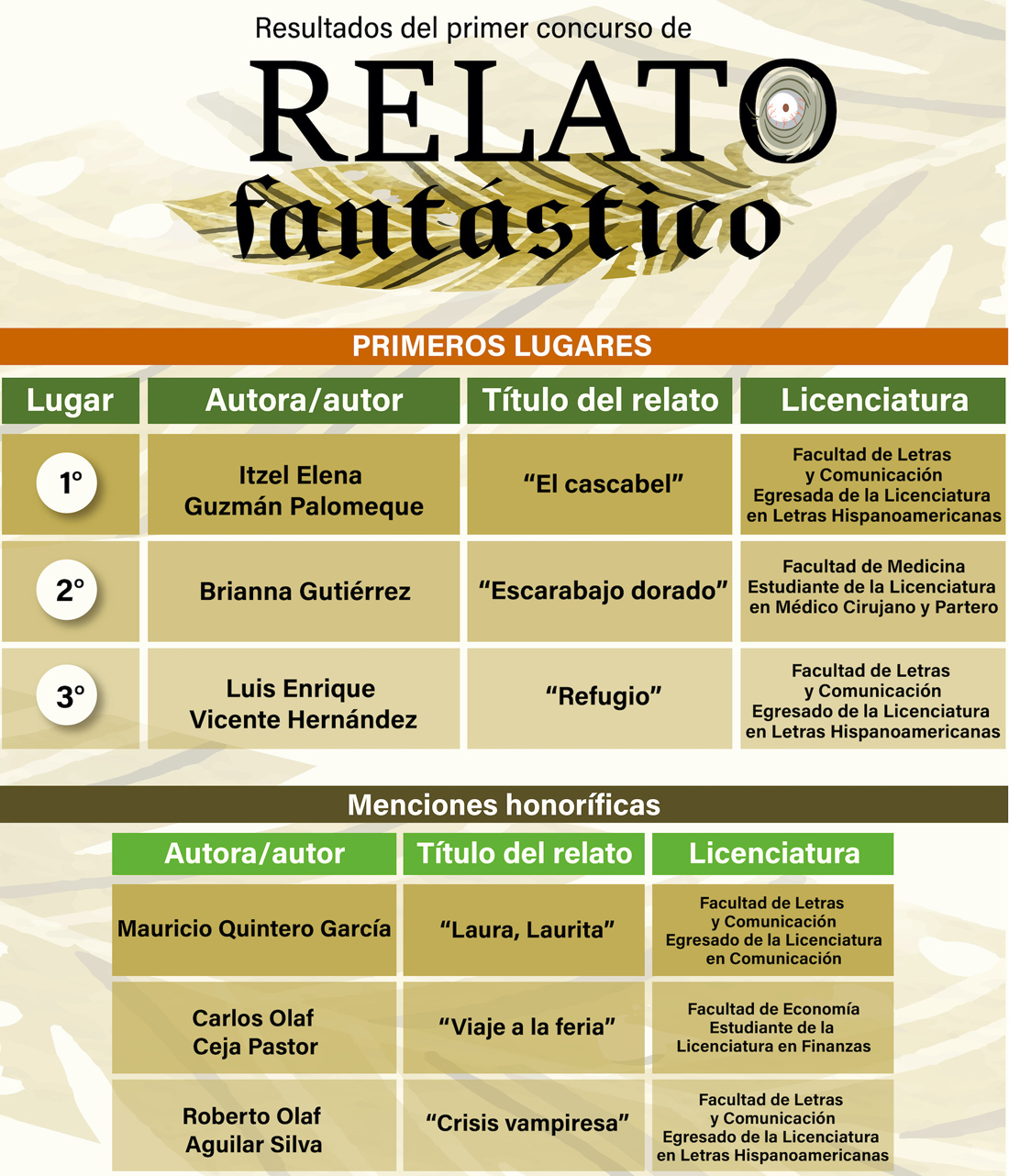 El primer lugar fue para Itzel Elena Guzmán Palomeque, egresada de la licenciatura en Letras Hispanoamericanas de la Falcom, con el relato “El cascabel”; el segundo para Brianna Gutiérrez, alumna de la Licenciatura de Médico Cirujano y Partero de la Facultad de Medicina, con el “Escarabajo dorado” y el tercero para Luis Enrique Vicente Hernández, egresado de la licenciatura en Letras Hispanoamericanas, con “Refugio”.