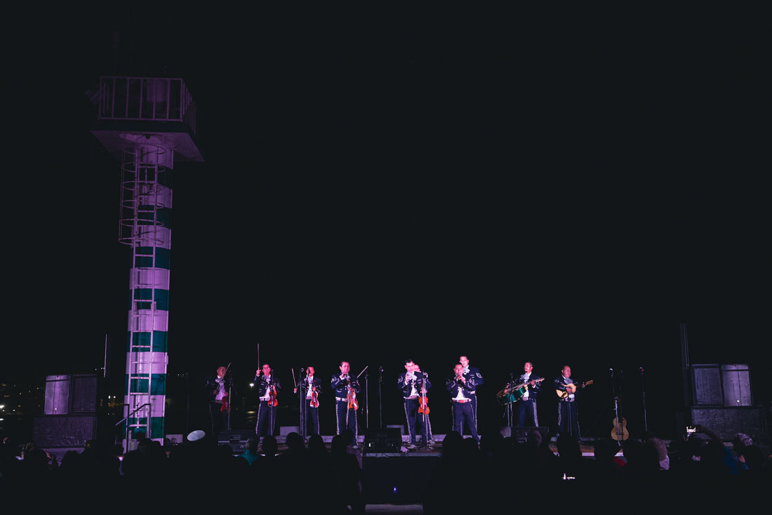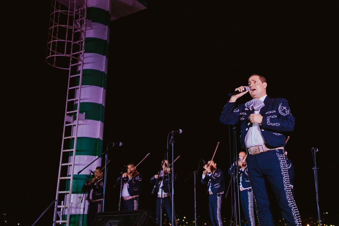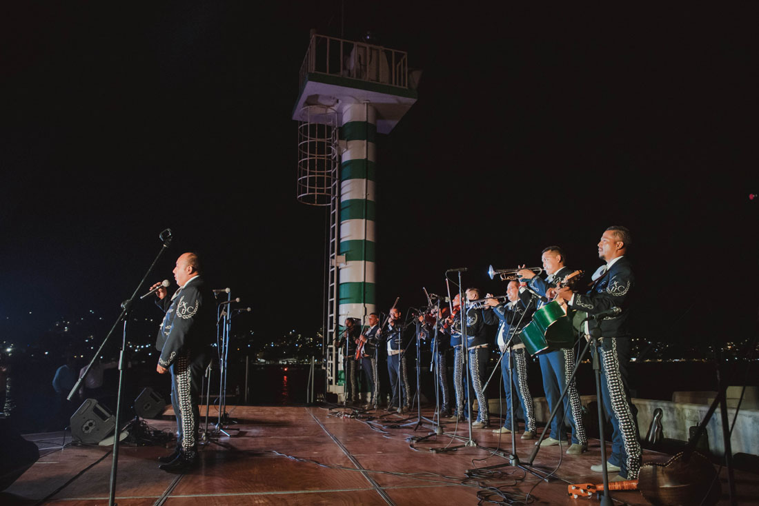El cielo nocturno, una costa iluminada y el sonido de las olas fueron el paisaje donde se desarrolló la celebración del 30 aniversario del Mariachi Universidad de Colima, bajo la dirección de Eliseo Madrigal Lucatero, en la Escollera de Las Brisas, Manzanillo.
