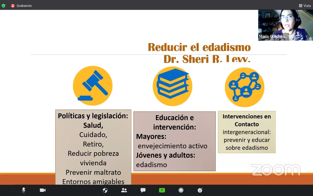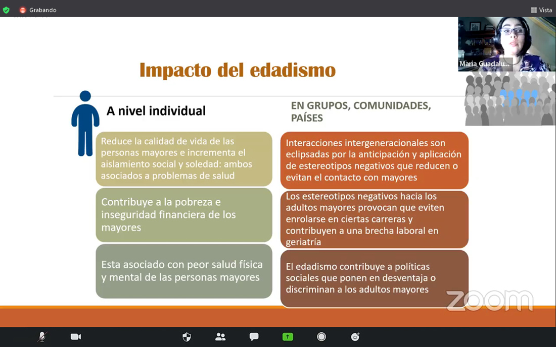 Posteriormente Guadalupe Jiménez, doctora en Psicología Clínica y de la Salud con máster en Psicología General Sanitaria por la Universidad Autónoma de Madrid (España), mencionó que según la Organización Mundial de la Salud “el edadismo está presente en la forma de pensar (estereotipos), sentir (prejuicios) y actuar (discriminación) hacia los demás y hacia nosotros mismos en función de la edad, seamos o nhrs.