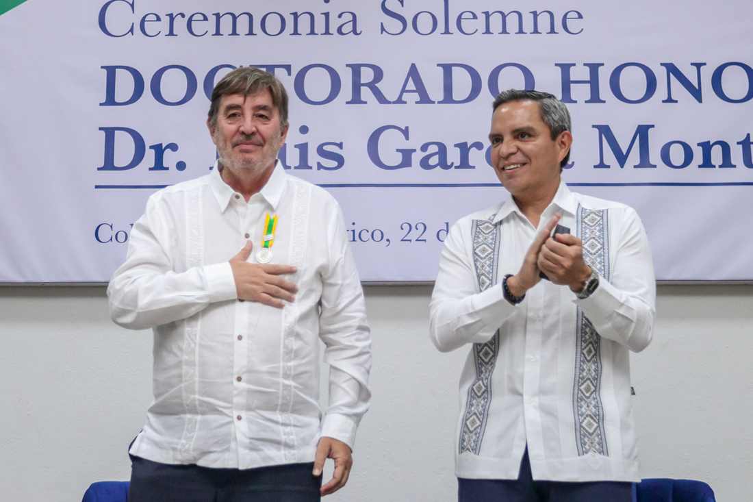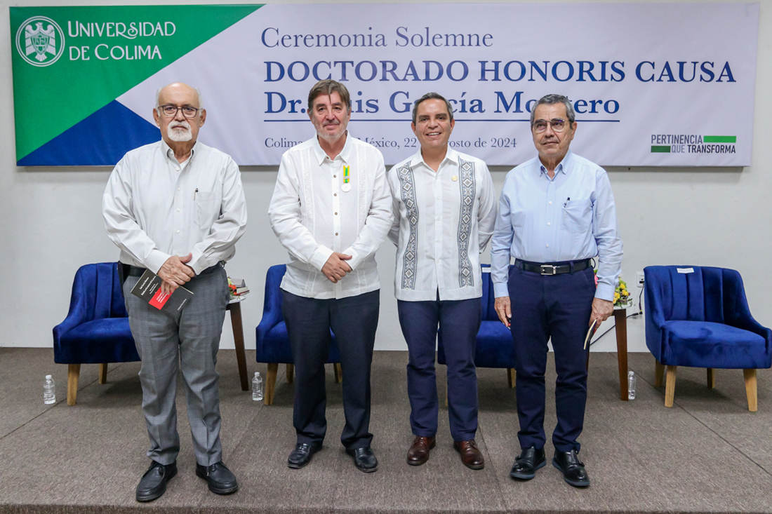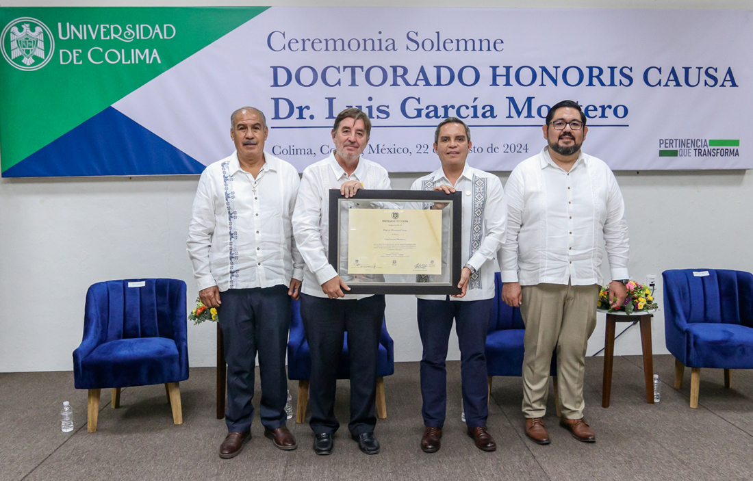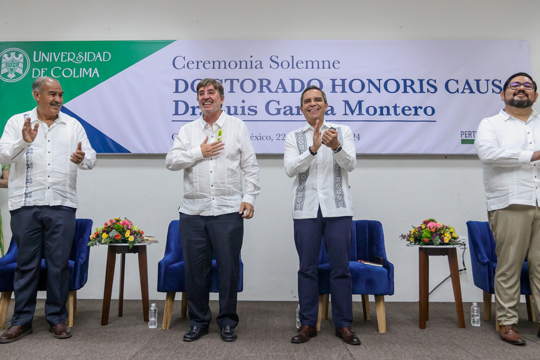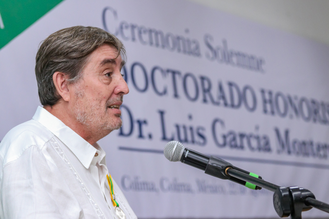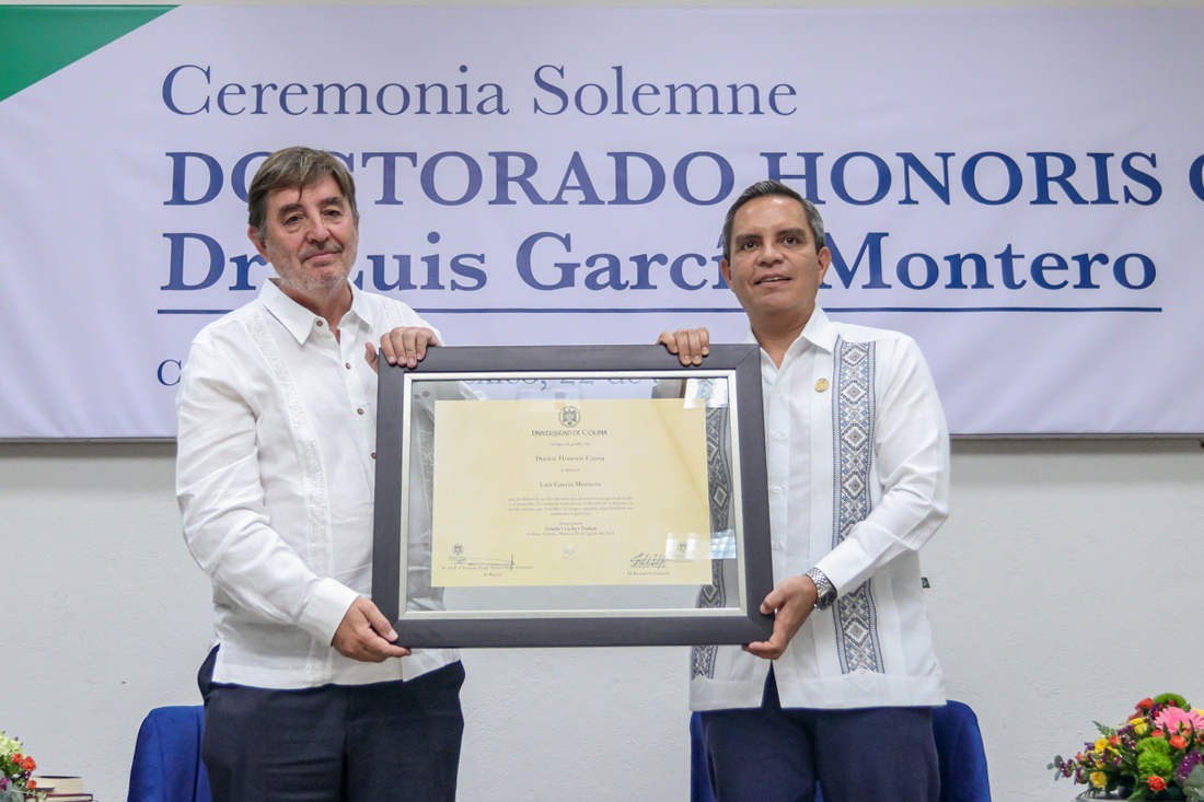 Este jueves, en ceremonia solemne, Christian Jorge Torres Ortiz Zermeño, rector de la Universidad de Colima, entregó el grado de Dr. Honoris Causa al poeta y escritor español Luis García Montero “por la calidad de su obra literaria, que de manera excepcional ayuda a comprender la condición humana en el devenir de la historia”.