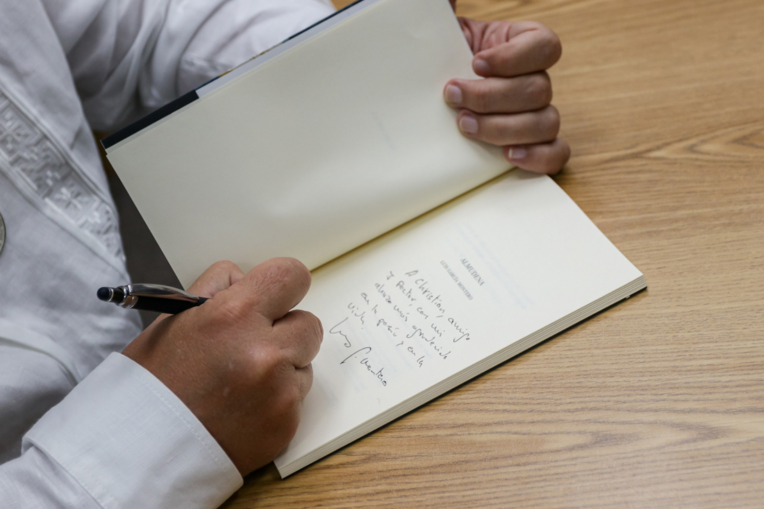 Una vez reconocido con el grado de Doctor Honoris Causa, Luis García Montero, visiblemente emocionado, agradeció la distinción y dijo que recibir estos reconocimientos lo llevan a la reflexión. “Comprenderán que cuando recibo un premio de éstos, aparte de estar muy agradecido, pienso que soy lo que soy en un espejo roto y que mi conciencia y mi compromiso con la cultura y con la pedagogía es fundamental”.