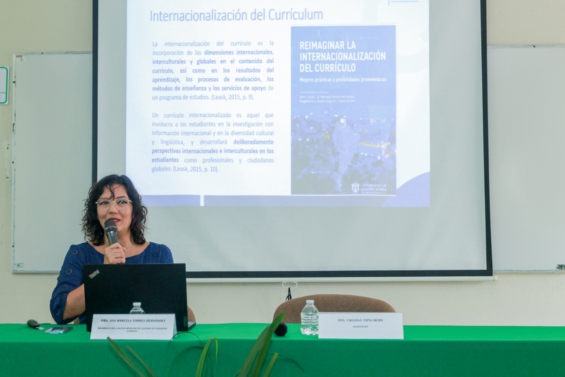 En su conferencia, Ana Marcela Torres Hernández, presidenta de COMEPO, dijo que “considerando la amplia y distinguida tradición de internacionalización de la Universidad de Colima, simplemente trataré de aportar experiencias a partir de la elaboración de un libro editado en 2022: ‘Repensar la internacionalización del currículo’, y presentaré un panorama sobre buenas prácticas internacionales para la internacionalización del Currículum en Educación Superior”.