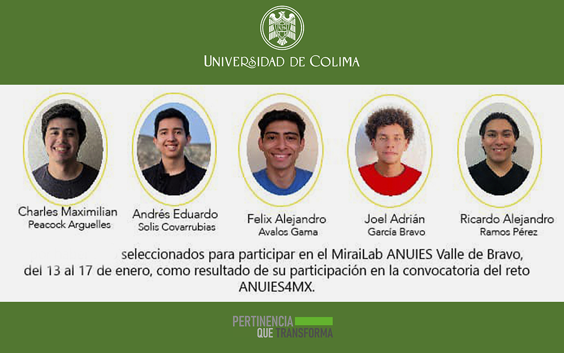 Cinco estudiantes de la Facultad de Telemática de la Universidad de Colima fueron seleccionados para participar en el MiraiLab ANUIES, un importante laboratorio de inteligencia artificial y neurociencias ubicado en Valle de Bravo, México. Los alumnos participarán del 13 al 17 de enero de 2025, tras destacar en la convocatoria Reto ANUIES4MX Rumbo a Japón 2025.