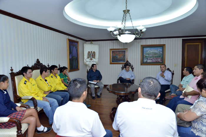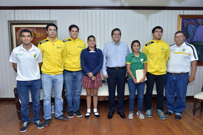 El rector de la Universidad de Colima, José Eduardo Hernández Nava, recibió en su despacho a cuatro estudiantes universitarios que fueron convocados a la pre Selección Nacional para formar parte de los equipos de futbol y balonmano que representarán a México en la Universiada Mundial, a celebrarse en Corea del Sur del 4 al 14 de julio del presente año.