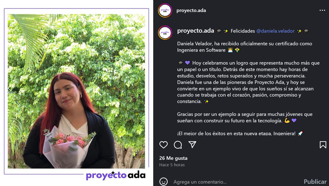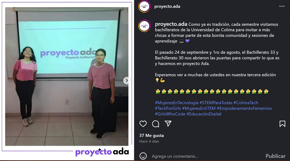 Entre las impulsoras del proyecto destacan Daniela Cruz y Scarlett Solórzano, fundadoras de Proyecto Ada, así como las mentoras Rosa Cruz, Nereyda Pérez, María José Ávila, Abril Palomino, Nataly Iglesias y Daniela Velador, quienes gestionan la cuenta de Instagram @proyecto.ada, espacio que reúne a más de 200 seguidoras. En esa plataforma -explicó el profesor- las jóvenes comparten contenidos, experiencias y testimonios de mujeres dedicadas a la tecnología, convirtiéndose en referentes positivos para las nuevas generaciones.