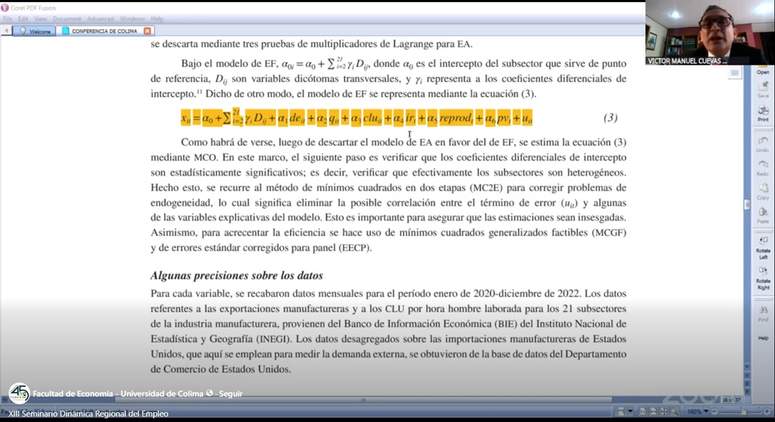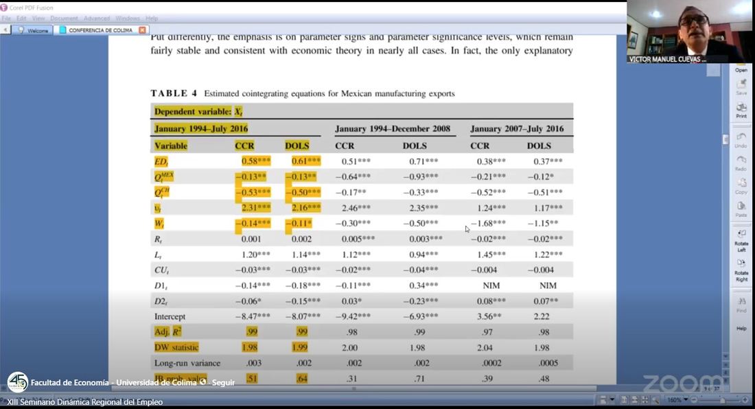 Dentro del XIII Seminario “Dinámica regional del empleo y la actividad económica en México”, organizado por la Facultad de Economía de la Universidad de Colima y la Red de Investigación en Innovación Empleo y Manufactura (RIIEM), el investigador de la Universidad Autónoma Metropolitana (UAM), unidad Azcapotzalco, Víctor Cuevas Ahumada dictó la Conferencia: “Efectos del tipo de cambio real en las exportaciones, las importaciones y la balanza comercial de México”.