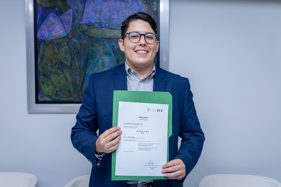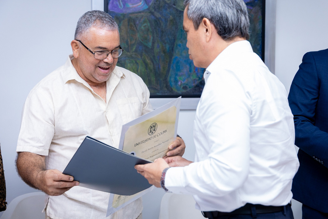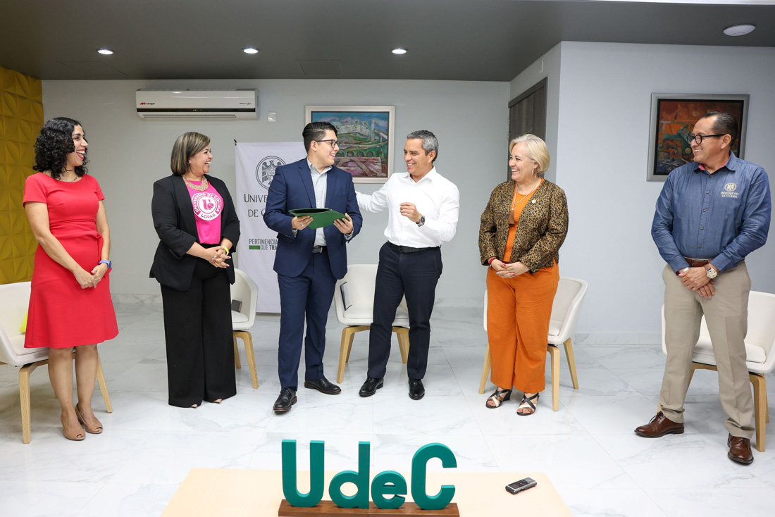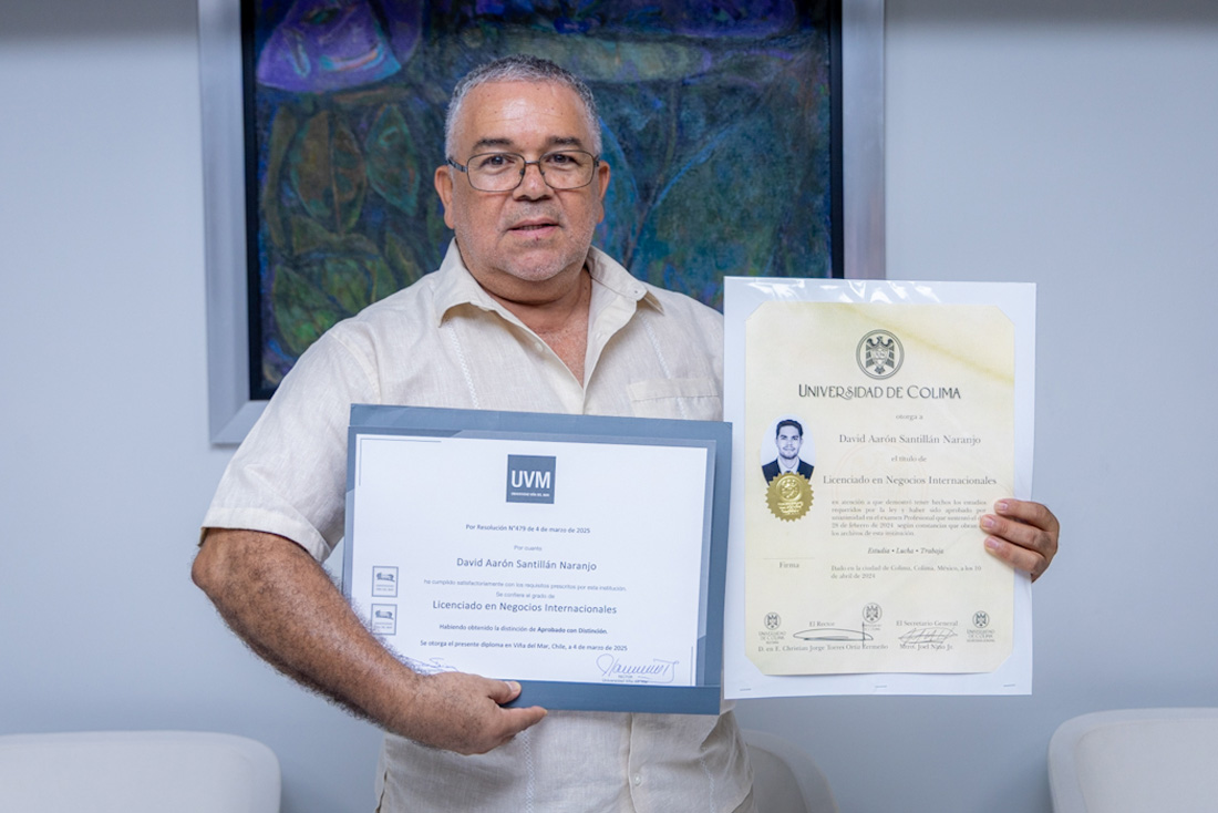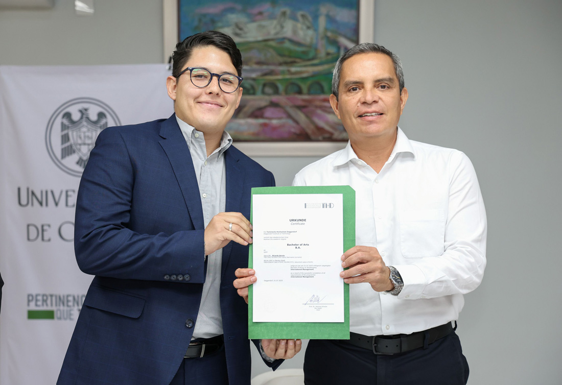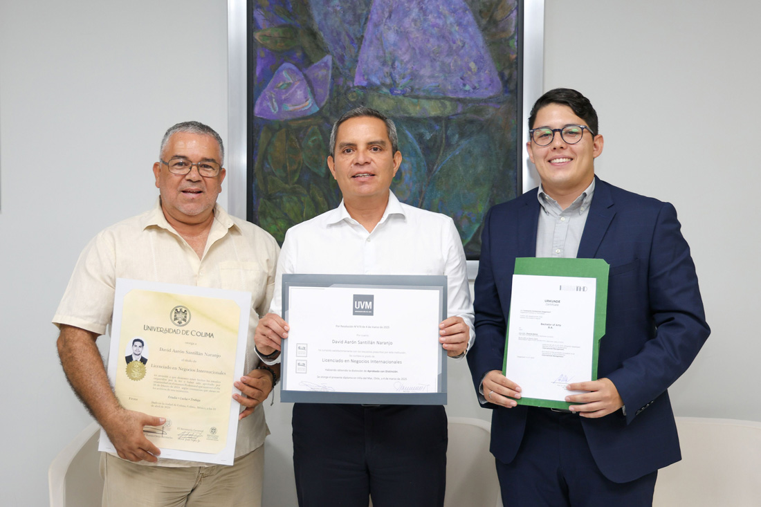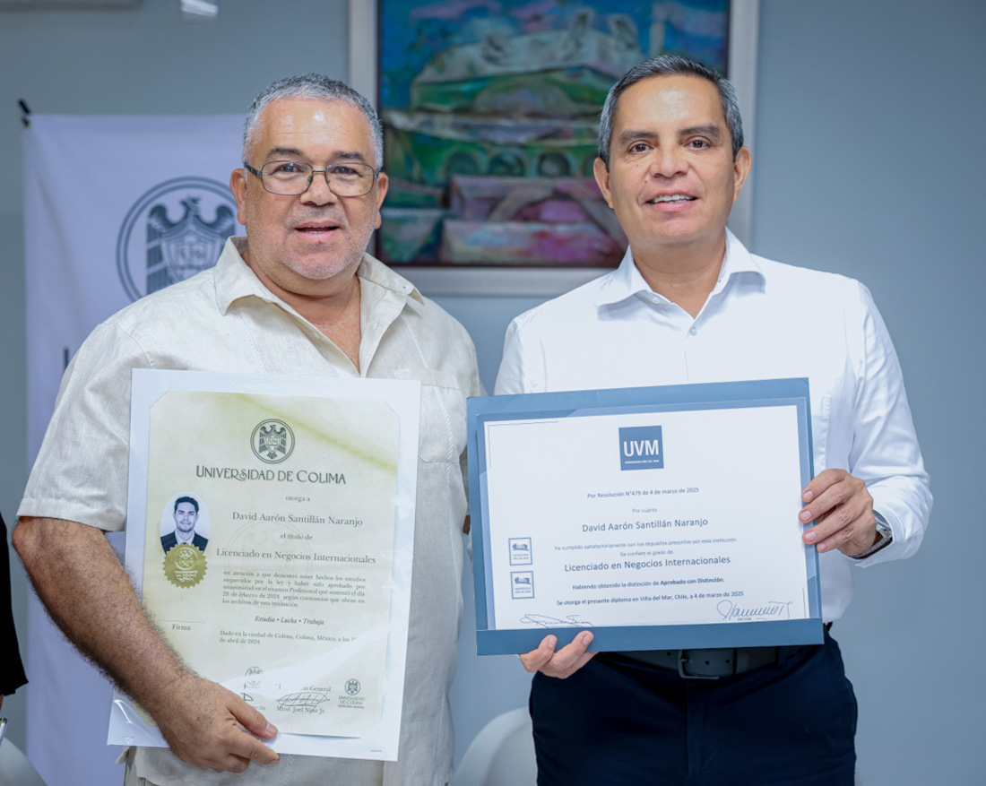 La tarde de este martes, en el Salón de Protocolo de Rectoría, Christian Jorge Torres Ortiz Zermeño, rector de la Universidad de Colima entregó dos títulos de Doble Grado a Honorio Santillán en nombre de su hijo, David Aaron Santillán Naranjo y a Ricardo Adrián Servín Llanes, ambos egresados de la carrera de Negocios Internacionales de la Facultad de Economía y egresados también de la Universidad de Viña del Mar en Chile y del Deggendorf Institute of Technology en Alemania, respectivamente.