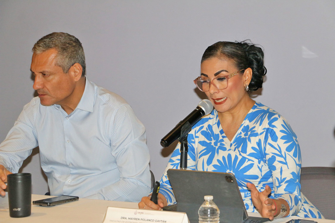 Como parte del programa, la Dra. Mayrén Polanco Gaytán, responsable del Cuerpo Académico de Estudios en Ciencias Económicas y Financieras Aplicadas de la Facultad de Economía de la Universidad de Colima, impartió la conferencia “Retos y oportunidades en la renegociación del T-MEC”, en la que reflexionó sobre la necesidad de fortalecer la innovación, la productividad y la formación de capital humano para aprovechar los beneficios del tratado comercial.
