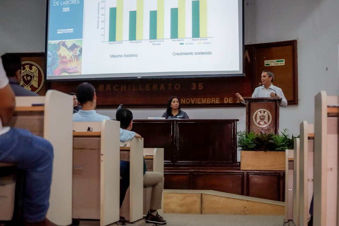 Zinc Pérez informó que el bachillerato opera en turno matutino con Programa de Bachillerato General, y que la mayoría de su matrícula son mujeres, lo que refleja una tendencia constante hacia la equidad.