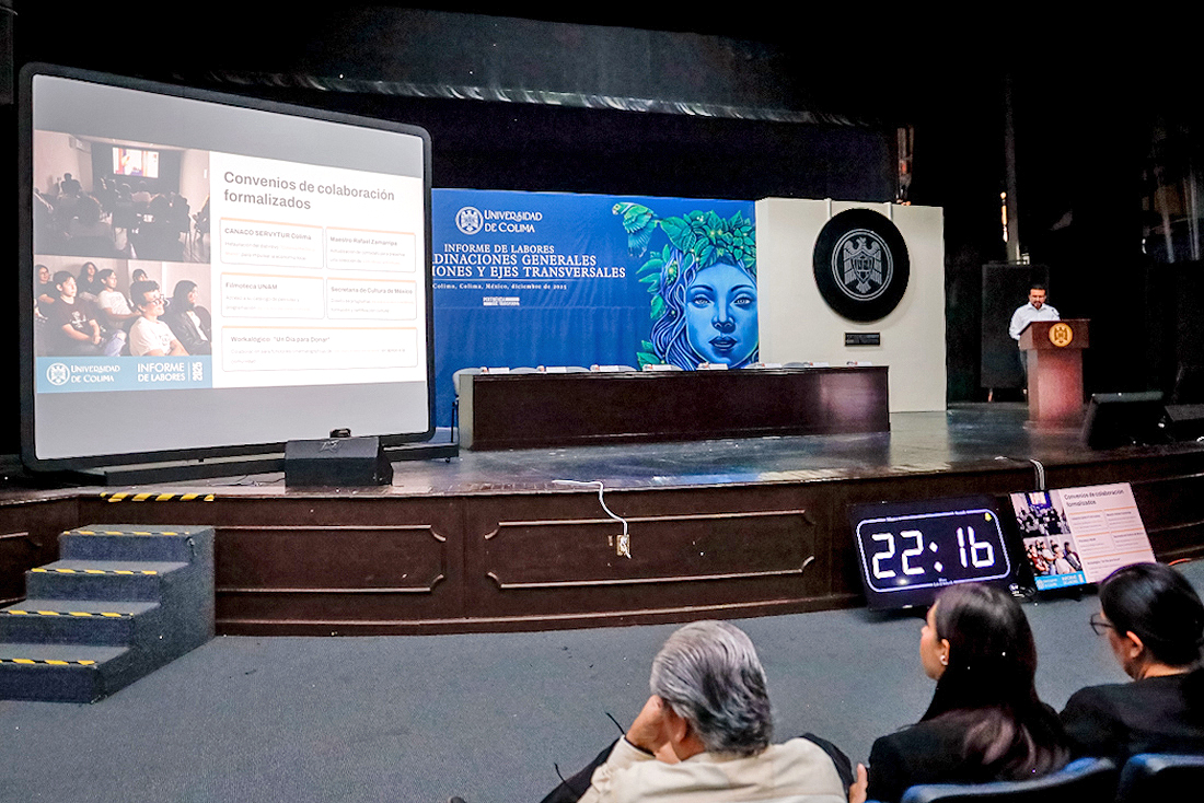 Carlos Ramírez Vuelvas, coordinador general de Extensión de la Universidad de Colima, presentó su informe anual de labores correspondiente a 2025, en el que destacó el intenso trabajo realizado para impulsar el arte, la cultura, el deporte, la formación comunitaria y la vinculación social. Subrayó que éste fue el último informe alineado con el Plan Institucional de Desarrollo 2022–2025, lo que permitió dimensionar mejor los avances, logros y desafíos alcanzados durante este ciclo.