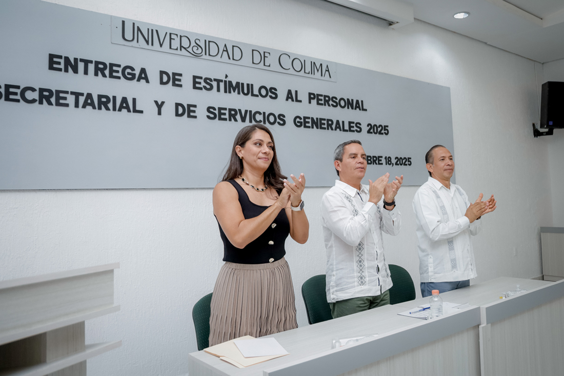 Este jueves, con el objetivo de premiar la contribución de quienes con su trabajo diario fortalecen el quehacer universitario, se llevó a cabo en el auditorio de Enfermería, la entrega de estímulos al personal secretarial y de servicios generales. Presidieron este evento Christian Jorge Torres Ortiz Zermeño, rector de la Universidad de Colima, Priscilia Juliana Álvarez Gutiérrez, directora general de Recursos Humanos y Luis Enrique Zamorano Manríquez, secretario general del SUTUC.