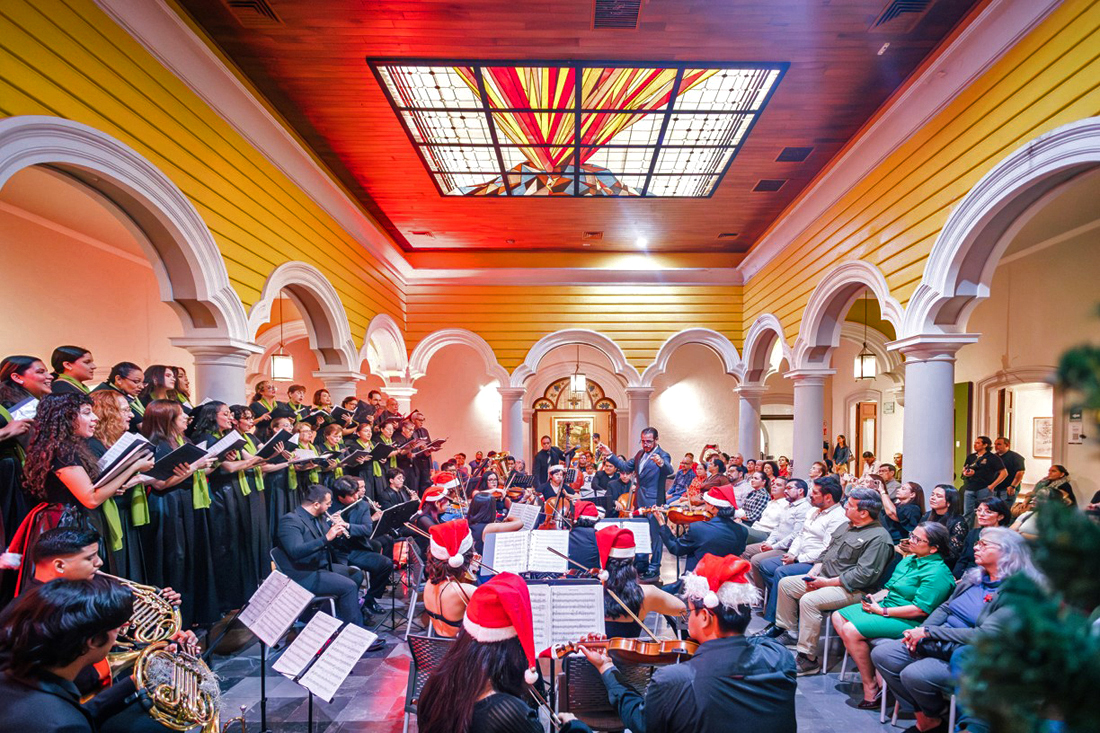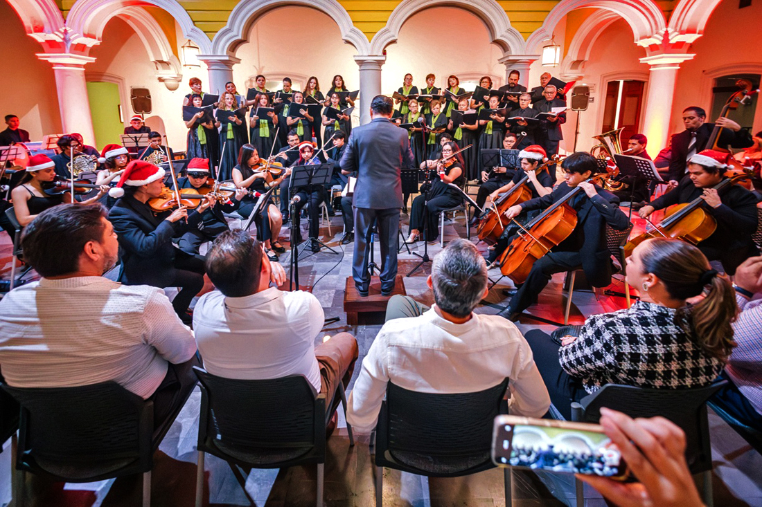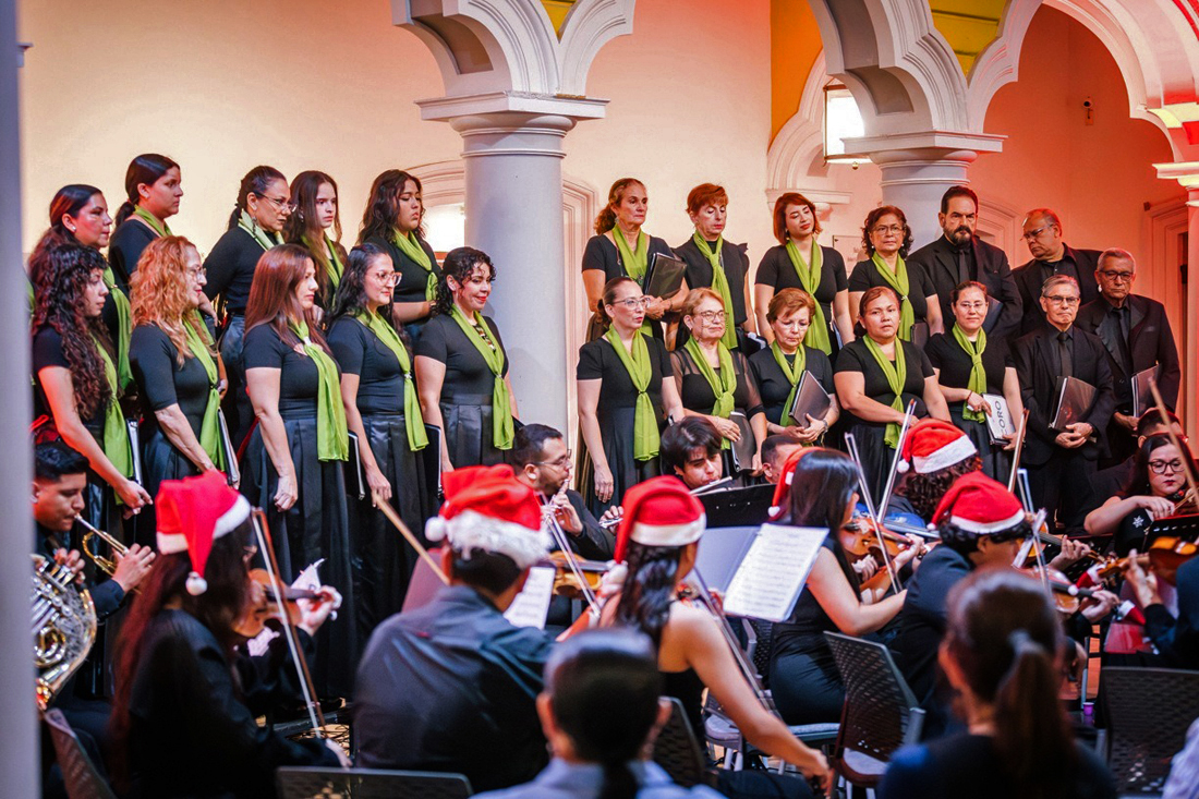 Para cerrar las actividades artísticas universitarias de este 2025, se llevó a cabo este jueves 18 de diciembre en la Pinacoteca Universitaria, el concierto “A Christmas Festival”, donde la Orquesta Sinfónica y el Coro de la Universidad de Colima, bajo la dirección del maestro José Antonio Frausto Zamora, ofrecieron un programa con temas de compositores como Wolfgang Amadeus Mozart, George Frederic Haendel, John Williams y Agustín Lara, en un acto que contó con la presencia del rector de la casa de estudios, Christian Torres Ortiz Zermeño.