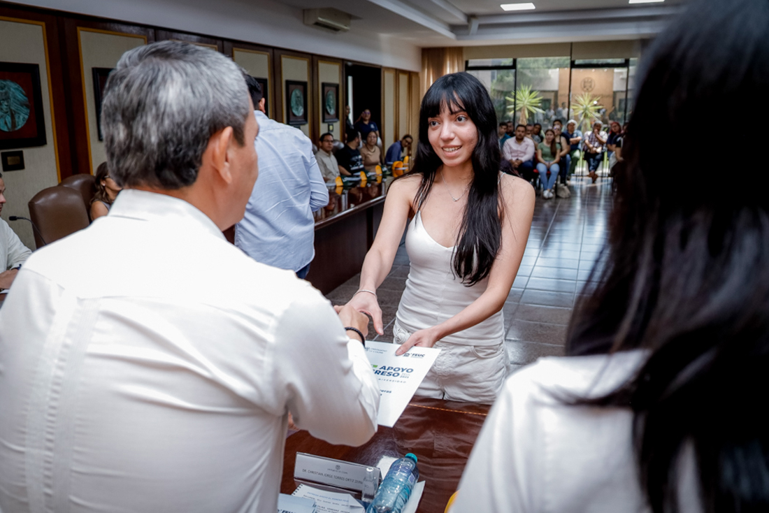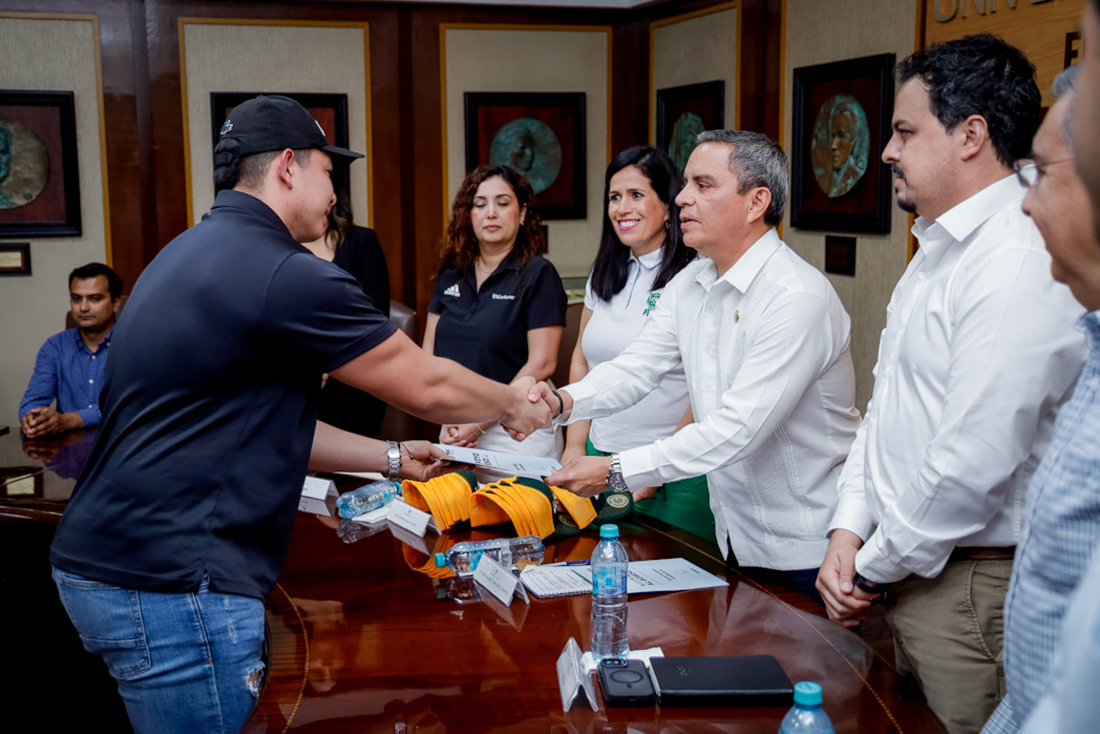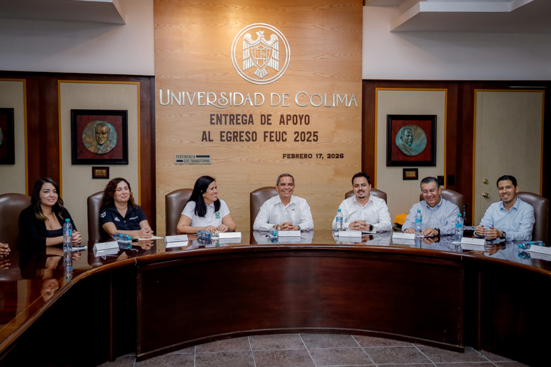 Como parte de las estrategias para impulsar la titulación de todos sus egresados y egresadas, la Universidad de Colima llevó a cabo este martes 17 de febrero, en el salón de Juntas de Rectoría, la entrega de la Beca por el Egreso FEUC-UdeC, beneficiando a 44 jóvenes que concluyeron sus estudios de educación superior en la institución. La entrega fue presidida por el rector Christian Jorge Torres Ortiz Zermeño y contó además con la presencia de los patrocinadores de la 11ª Carrera FEUC-UdeC, de la cual proviene el recurso de esta beca.