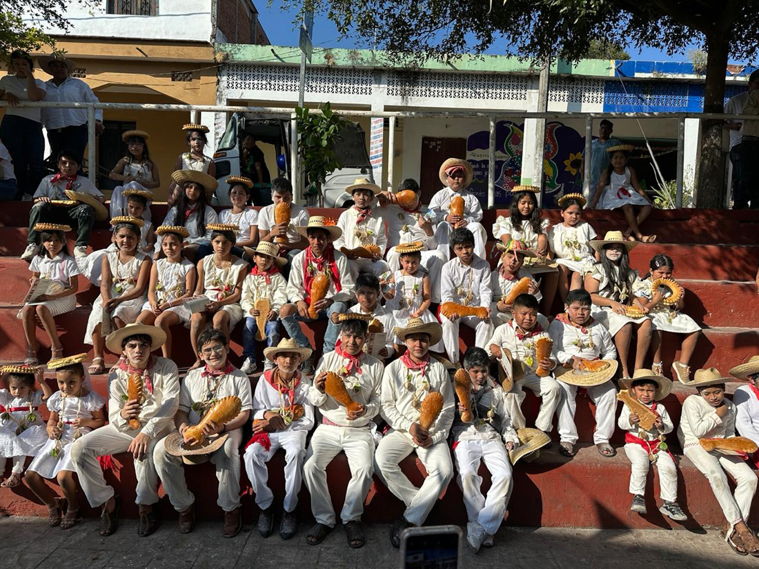 *Asimismo, se integraron al recorrido por la comunidad, entonando los cantos característicos de los Paspaques y compartiendo el pinole, gesto que simboliza la transmisión de alegría y bendiciones entre las y los participantes.