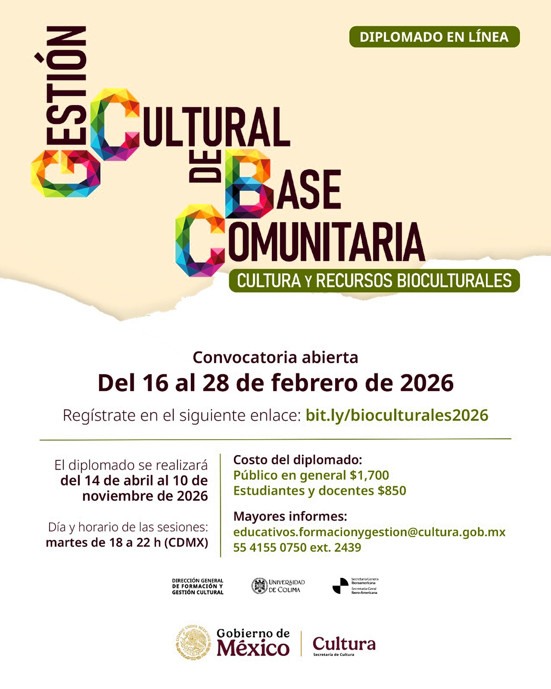La Secretaría de Cultura del Gobierno de México, a través de la Dirección General de Formación y Gestión Cultural, y la Universidad de Colima, mediante la Dirección de Extensión Cultural, en colaboración con la Secretaría General Iberoamericana, presentan la segunda edición del diplomado “Gestión cultural de base comunitaria. Cultura y recursos bioculturales”, un programa formativo que surgió del diálogo entre las comunidades, las instituciones públicas y la academia, con el objetivo de formar agentes comprometidos con la preservación de sus territorios, el entorno natural y la sostenibilidad.