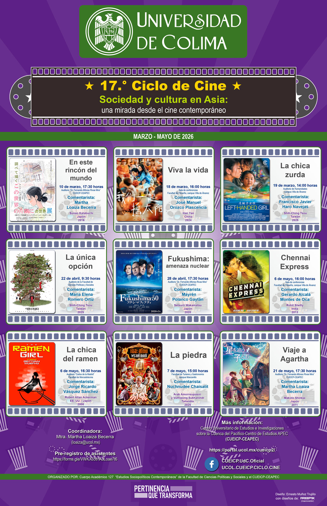 Pueden consultar la programación y detalles del ciclo de cine en la página oficial del Centro: https://portal.ucol.mx/cueicp2/, o en facebook.com/CUEICP.UdC.Oficial