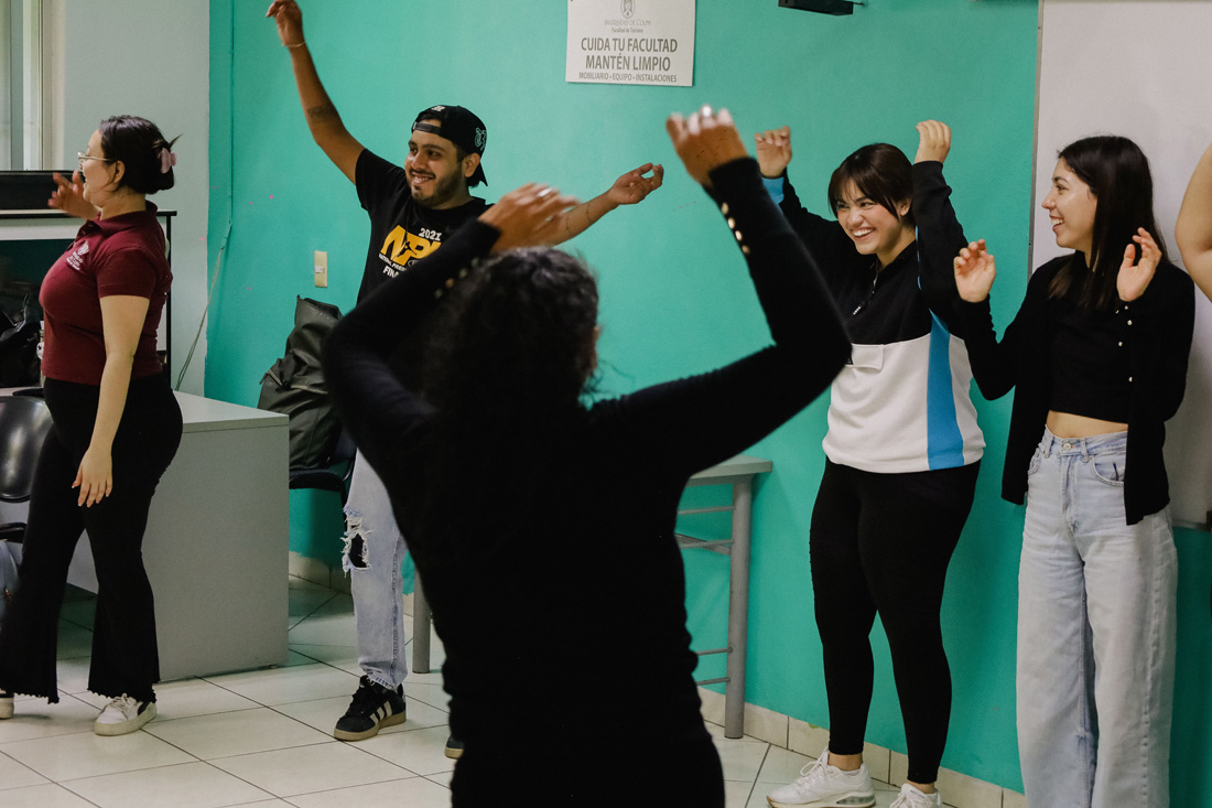 Como parte final de la sesión, el grupo realizó un ejercicio colectivo enfocado en la comunicación y la coordinación entre los integrantes, simulando la forma en que un grupo teatral trabaja en conjunto durante los procesos creativos.