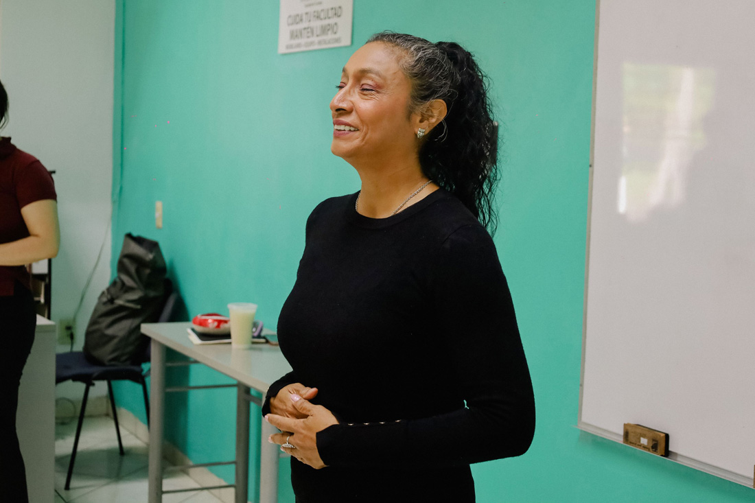 De manera simultánea, en otra aula del plantel, la actriz y dramaturga Carmen Solorio García dirigió un taller práctico enfocado en la preparación que realiza un actor antes de salir a escena. Durante la actividad, las y los estudiantes realizaron ejercicios corporales y de respiración que les permitieron reconocer la importancia de tomar conciencia del propio cuerpo y de la voz como herramientas fundamentales del trabajo teatral.