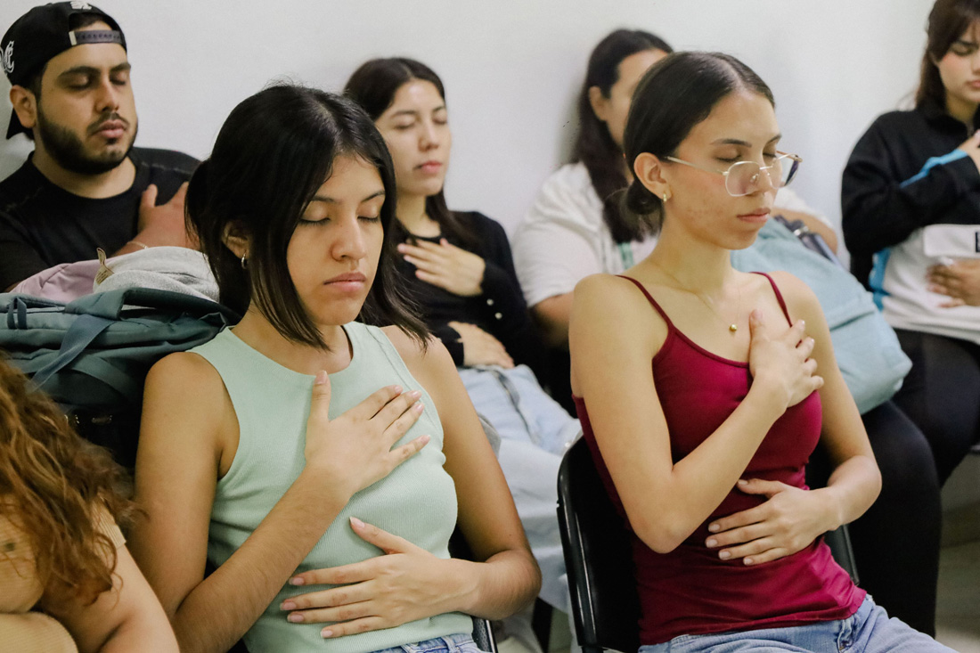 A lo largo del taller, la actriz explicó cómo activar el diafragma para mejorar la proyección vocal y la respiración, elementos que ayudan tanto a relajar el cuerpo como a generar energía para la interpretación escénica. Las y los participantes experimentaron distintas dinámicas que les permitieron identificar cómo la respiración se relaciona con la voz, el ritmo y la presencia corporal.