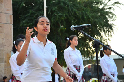 Además, alumnos del Bachillerato 4 realizaron un desfile de banderas que ilustró la reseña que la profesora de ese mismo plantel, Paula Celina Álvarez Ballesteros, leyó sobre la historia y evolución de nuestra enseña nacional, y la alumna del Bachillerato Uno, Mariana Reyes Rodríguez, declamó el poema