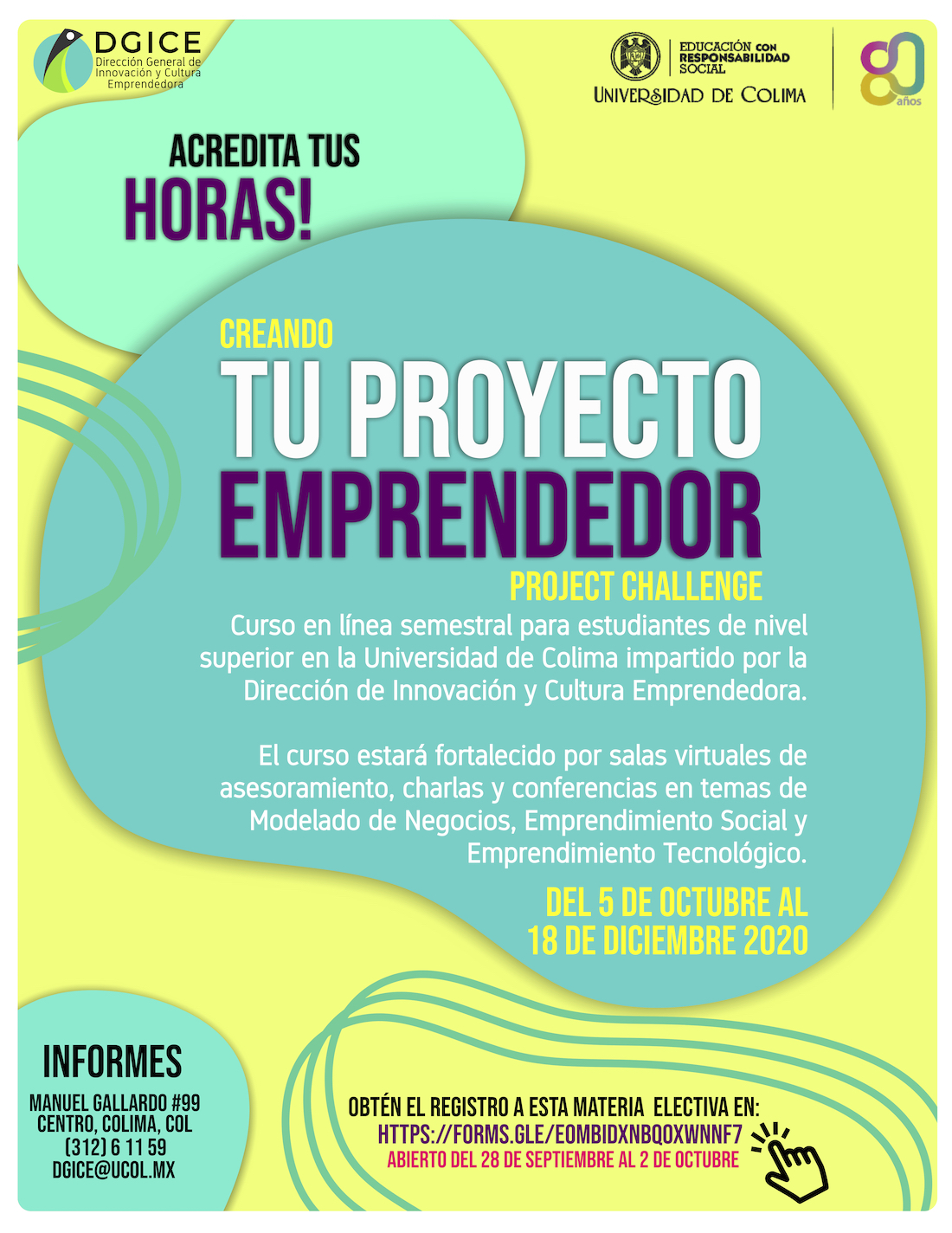 La Universidad de Colima invita a estudiantes de licenciatura a que tomen el curso en línea “Creando tu proyecto emprendedor: Project Challenge”, que se llevará a cabo del 5 de octubre al 18 de diciembre de este año a través de la Dirección General de Innovación y Cultura Emprendedora. Habrá salas virtuales de asesoramiento, charlas y conferencias en temas de modelado de negocios, emprendimiento social y emprendimiento tecnológico.