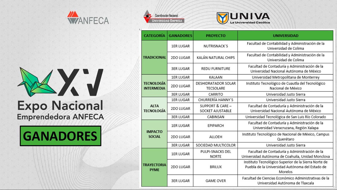 En competencia nacional contra 12 equipos celebrada en días pasados, los proyectos de impacto social sustentable y sostenible NutriSnack y Kalán Natural Chips, generados por estudiantes de la licenciatura en Administración de la Facultad de Contabilidad y Administración campus Colima, ganaron el primer y segundo lugar de la XV Expo Nacional de Emprendedores ANFECA 2021.