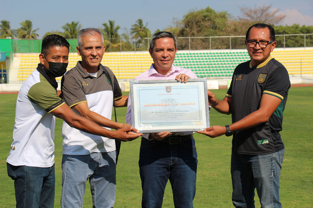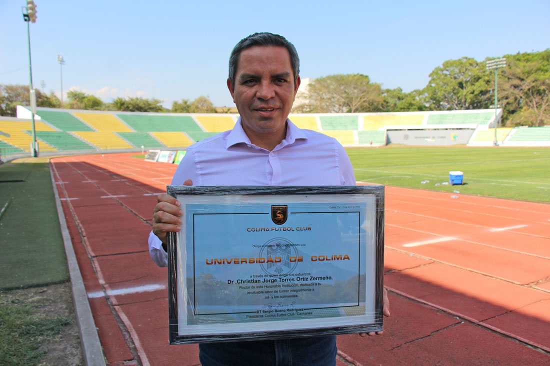 En ceremonia realizada en el medio tiempo del encuentro de futbol entre Caimanes y Gavilanes de Matamoros, que se desarrolló en el Estadio Olímpico Universitario, Sergio Bueno Rodríguez, presidente del Colima Futbol Club Caimanes, entregó un reconocimiento a la Universidad de Colima por su dedicación “a la invaluable labor de formar integralmente a las y los colimenses” y por apoyar a este equipo deportivo.